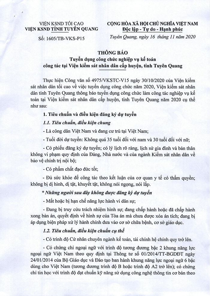Thông báo tuyển dụng công chức nghiệp vụ kế toán công tác tại Viện kiểm sát nhân dân cấp huyện, tỉnh Tuyên Quang