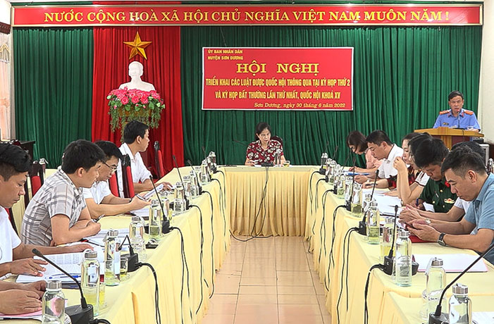 Thực hiện kế hoạch số 02/KH-HĐPH ngày 28/4/2022 của Hội đồng phối hợp phổ biến, giáo dục pháp luật huyện Sơn Dương. Ngày 30/6/2022, Hội đồng phổ biến, giáo dục pháp luật huyện Sơn Dương đã tổ chức Hội nghị triển khai thi hành các Luật được thông qua tại kỳ họp thứ 2 và kỳ họp bất thường lần thứ nhất Quốc hội khóa XV với thành phần tham dự gồm đại diện lãnh đạo các Ban Đảng, cơ quan, đơn vị, trường học đóng trên địa bàn huyện tại điểm cầu Ủy ban nhân dân huyện Sơn Dương và 31 điểm cầu tại Ủy ban nhân dân các xã, thị trấn trên địa bàn huyện Sơn Dương.