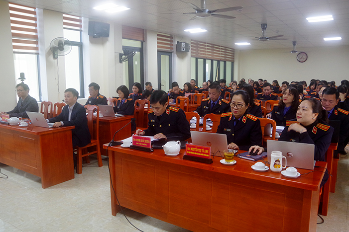 Tiếp tục đẩy mạnh thực hiện Chỉ thị số 03/CT-VKSTC ngày 17/5/2021 của Viện trưởng Viện KSND tối cao về việc tăng cường ứng dụng công nghệ thông tin, thúc đẩy chuyển đổi số trong ngành KSND, Kế hoạch số 208/KH-VKSTC ngày 05/9/2024, Công văn số 5390/VKSTC-C2 ngày 02/12/2024 của Viện KSND tối cao, ngày 30/12/2024, VKSND tỉnh Tuyên Quang phối hợp với VNPT Tuyên Quang tổ chức hội nghị Tập huấn triển khai mở rộng phần mềm quản lý văn bản trong ngành KSND cho các đ/c Trưởng phòng, Phó Trưởng phòng và tương đương; Viện trưởng, Phó Viện trưởng Viện KSND cấp huyện, công chức Viện kiểm sát hai cấp tỉnh Tuyên Quang. Hội nghị được tổ chức trực tiếp tại trụ sở Viện KSND tỉnh kết nối đến các điểm cầu trực tuyến của Viện KSND các huyện, thành phố.
